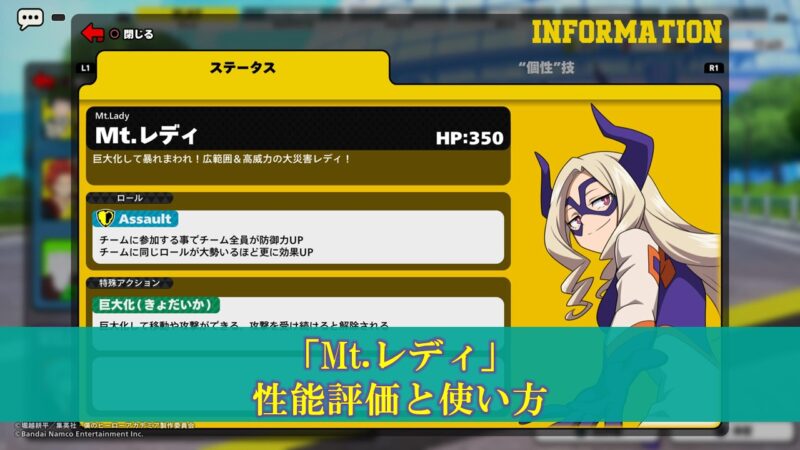 【ヒロアカUR】「Mt.レディ」性能評価と使い方(入手方法、立ち回り)更新日:2023年10月28日バトロワ こんちには!ぽいずみです。 本記事では僕のヒーローアカデミアウルトラランブルのキャラクター「Mt.レディ」の使い方について考察します。 基本情報 入手方法 最初から使用可能。 キャラクター性能 項目 コンセプト 巨大化し […] 続きを読む