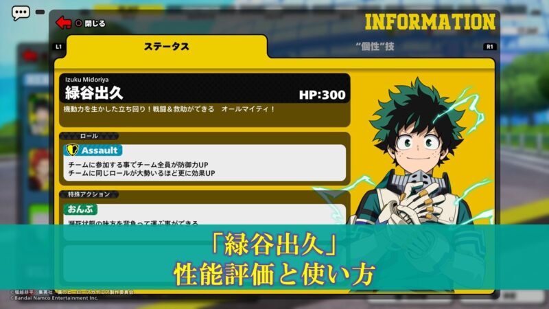 【ヒロアカUR】初心者のための「緑谷出久」性能評価と使い方(入手方法、立ち回り)更新日:2023年10月15日バトロワ こんちには!ぽいずみです。 本記事では僕のヒーローアカデミアウルトラランブルのキャラクター「緑谷出久」の使い方について考察します。 基本情報 入手方法 最初から使用可能。 キャラクター性能 項目 コンセプト 機動力を生か […] 続きを読む